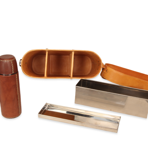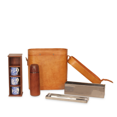 Antique Thermos Leather Flask with 4 Burleigh Staffordshire England Victorian Chintz Tea Cups in Leather Case Sale