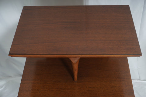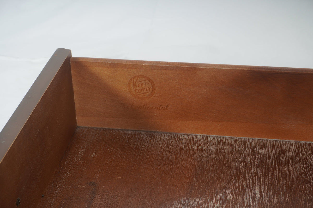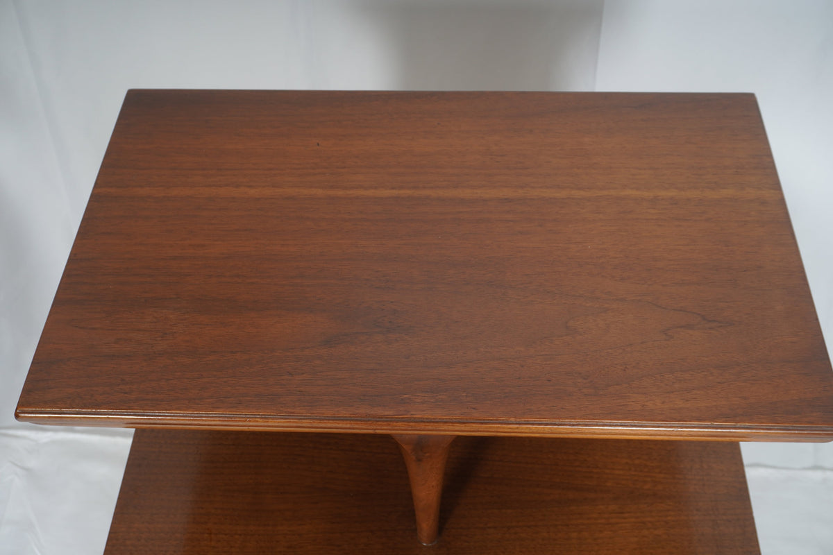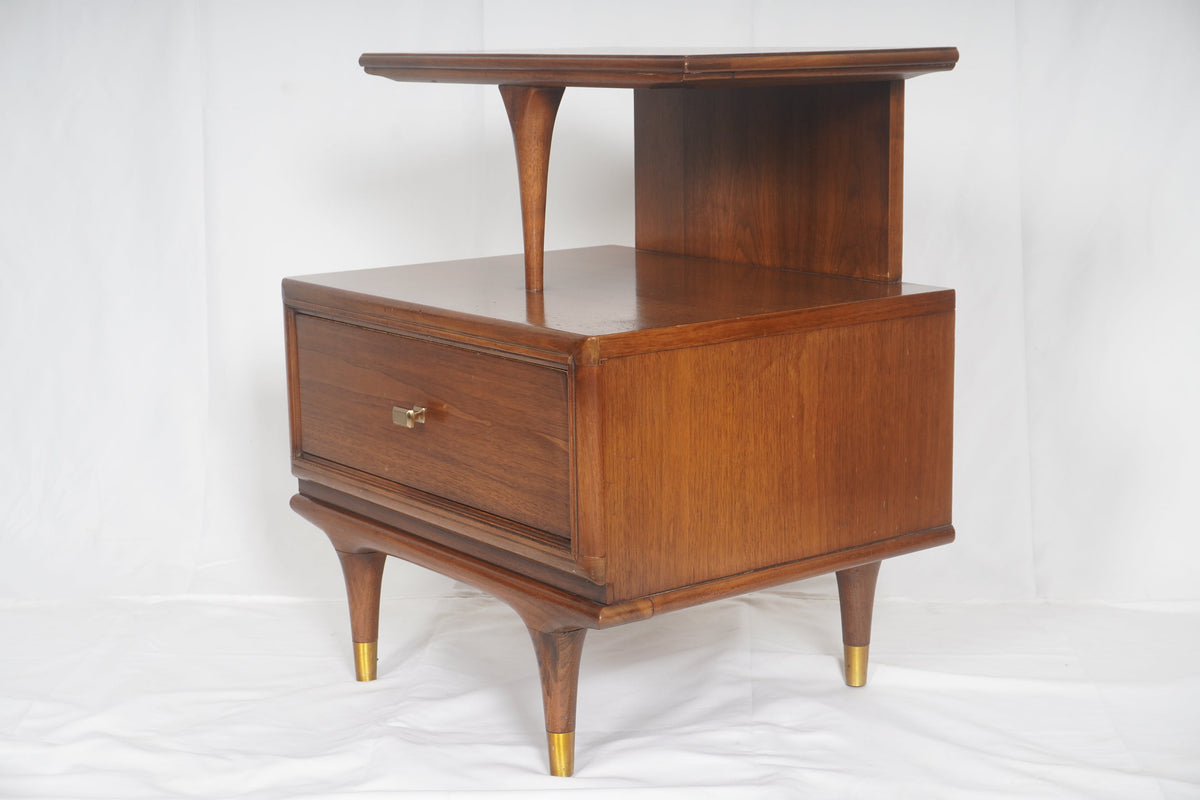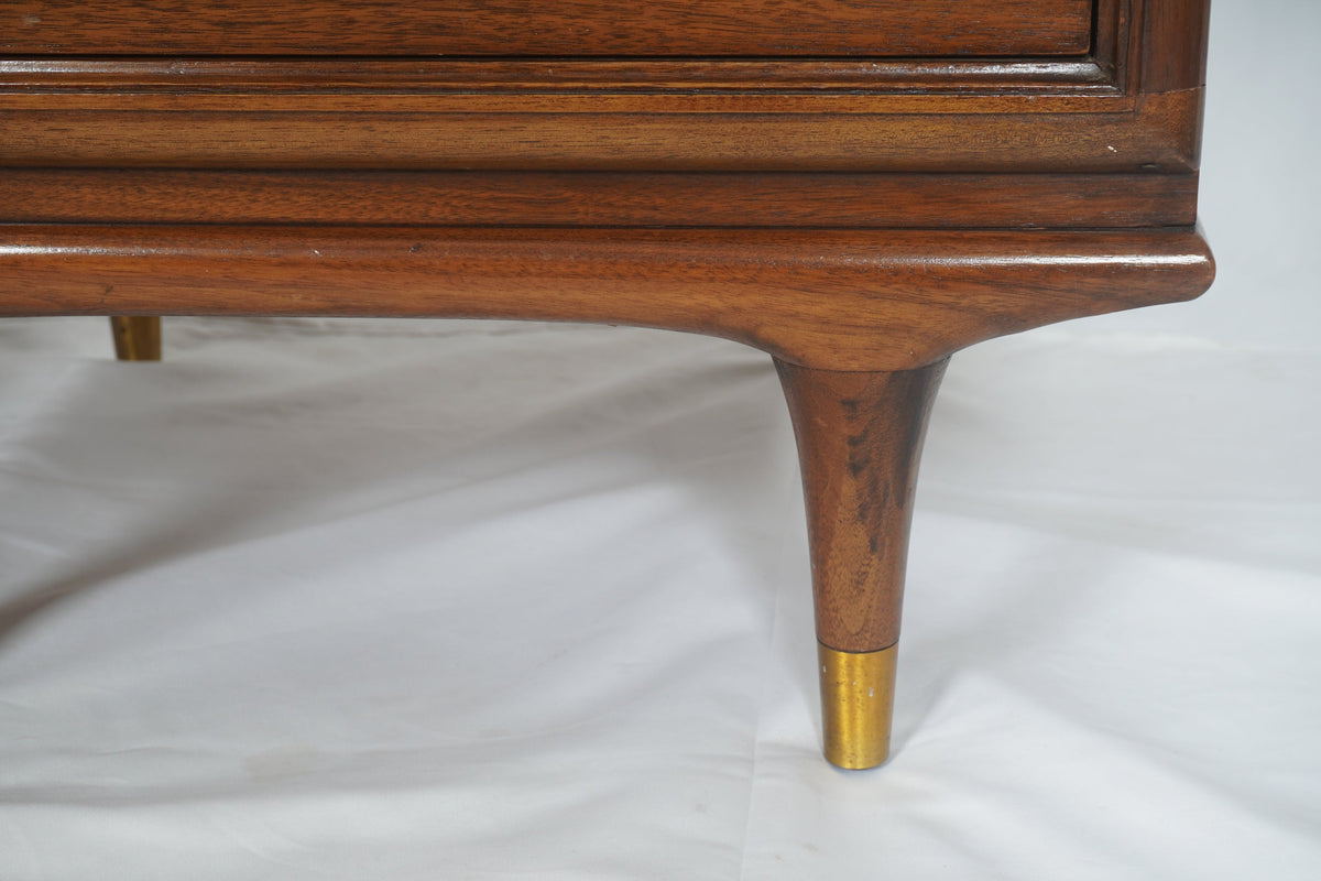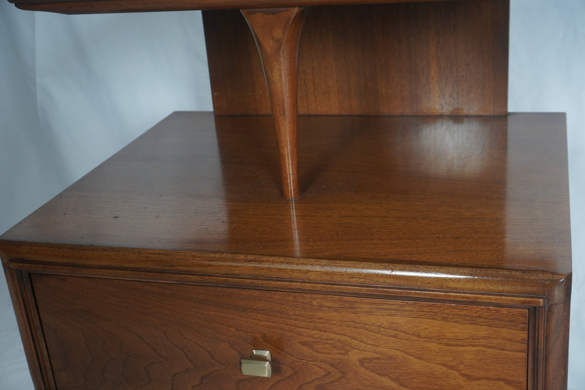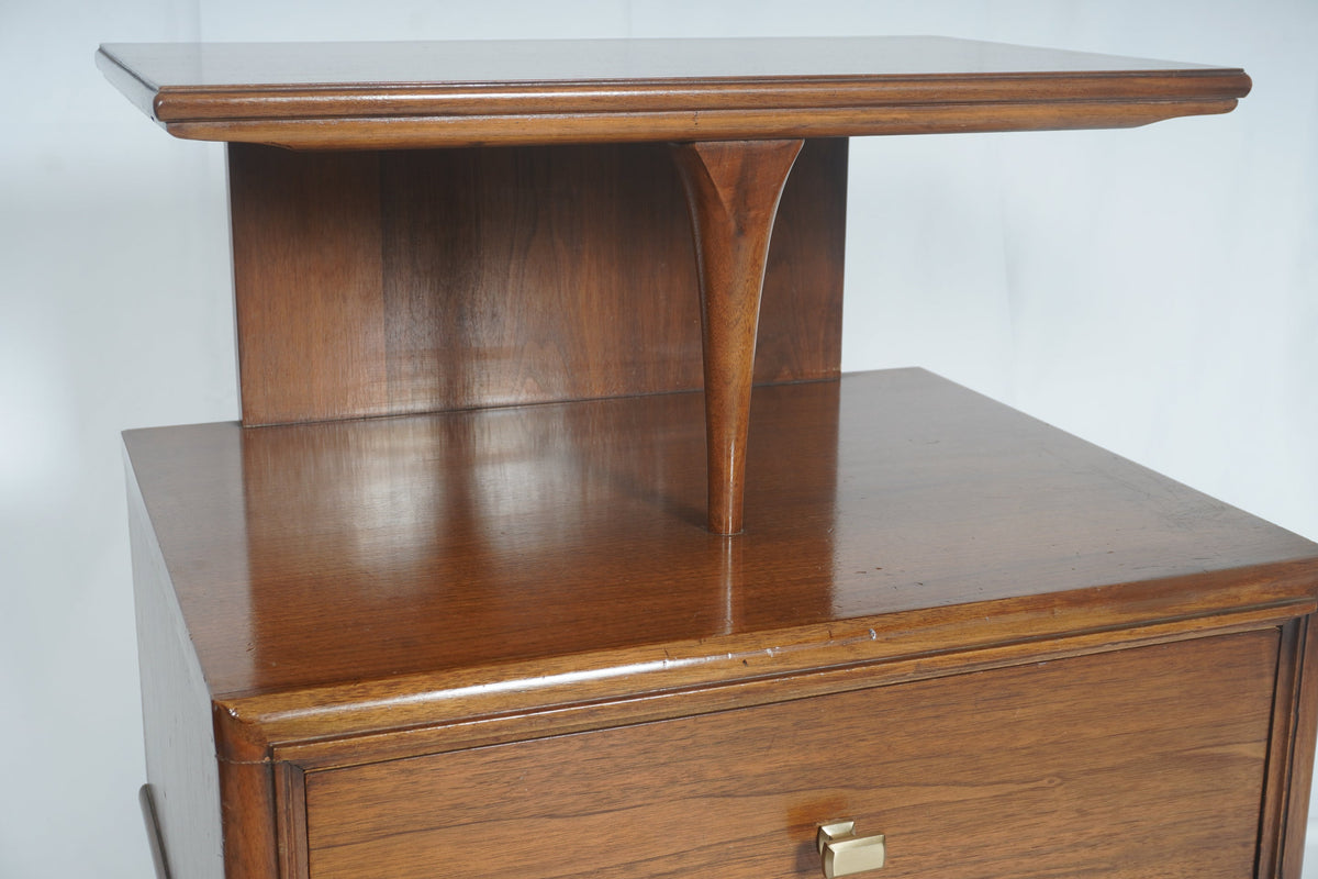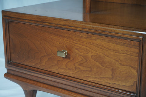 This pair of Kent Coffey Continental Mid-Century nightstands showcases timeless walnut craftsmanship with elegant sculptural details. Featuring a unique two-tier design, each piece offers an open display shelf above a spacious drawer, accented with a brass pull. The tapered legs with brass-capped feet enhance the sleek profile, reflecting the refined aesthetics of the era. A perfect blend of form and function, these nightstands bring warmth and character to any modern or vintage-inspired space.