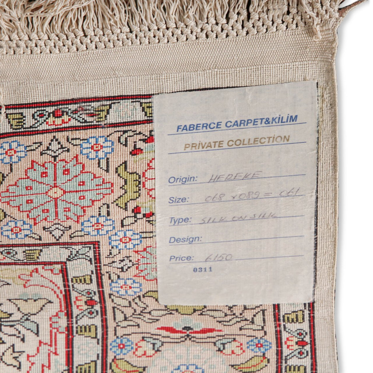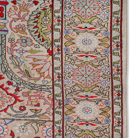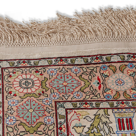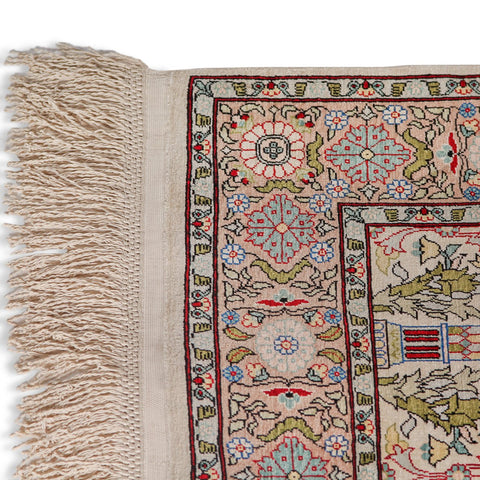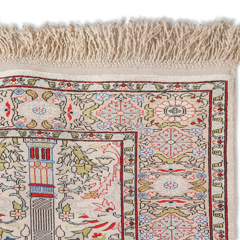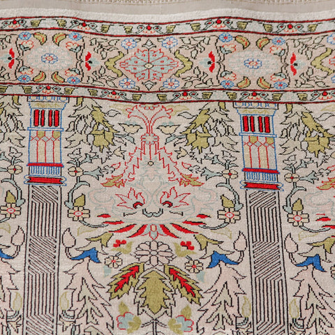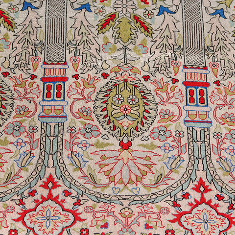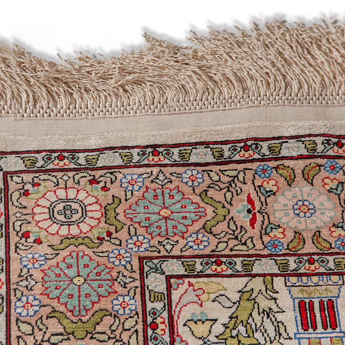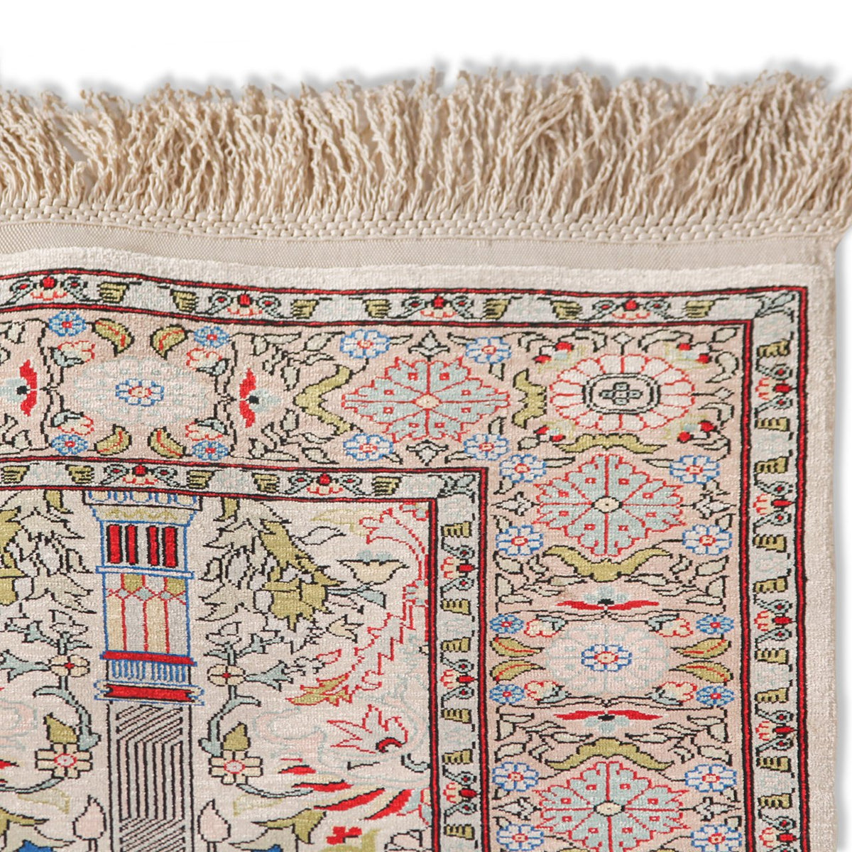 A beautiful genuine Hereke Silk Carpet Hand Knotted by skillful weavers with Wool & Silk Material, reflecting incredible care and attention to fine detail in its design and composition. Red, light green, light blue, yellow, and ivory colors permeate the visual imagery associated with prayer, perhaps signifying the interconnections of the life, flower motifs, and scrolls throughout the border.