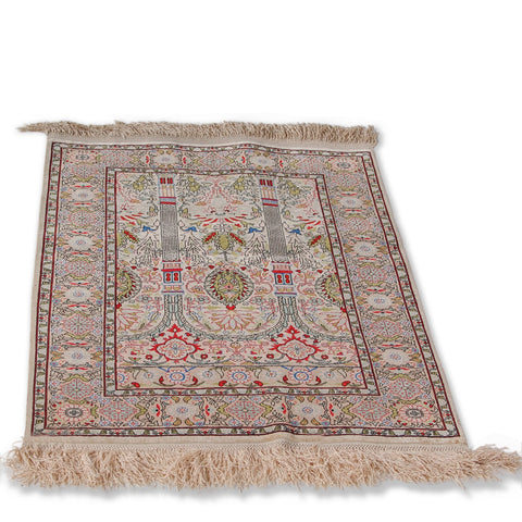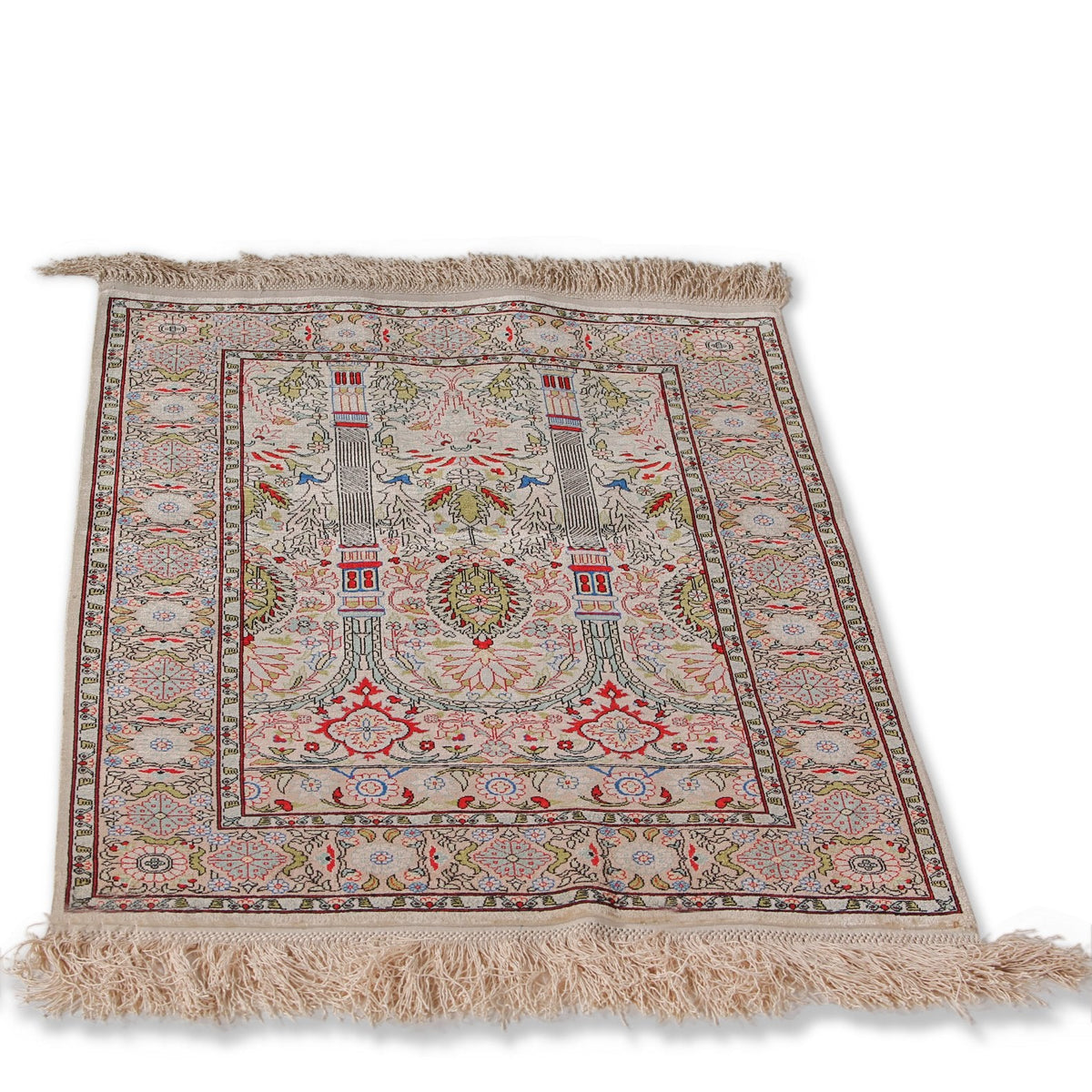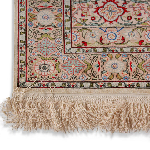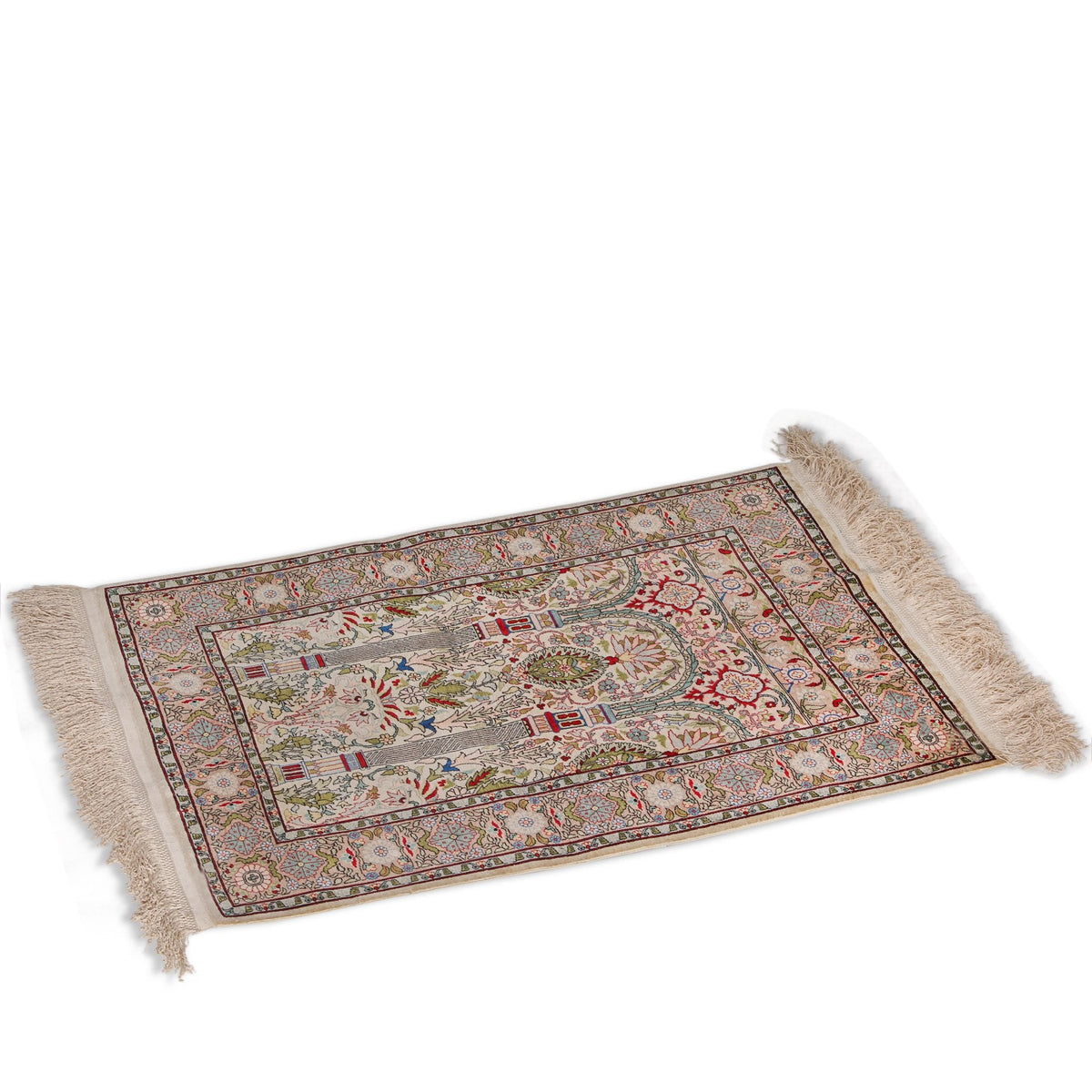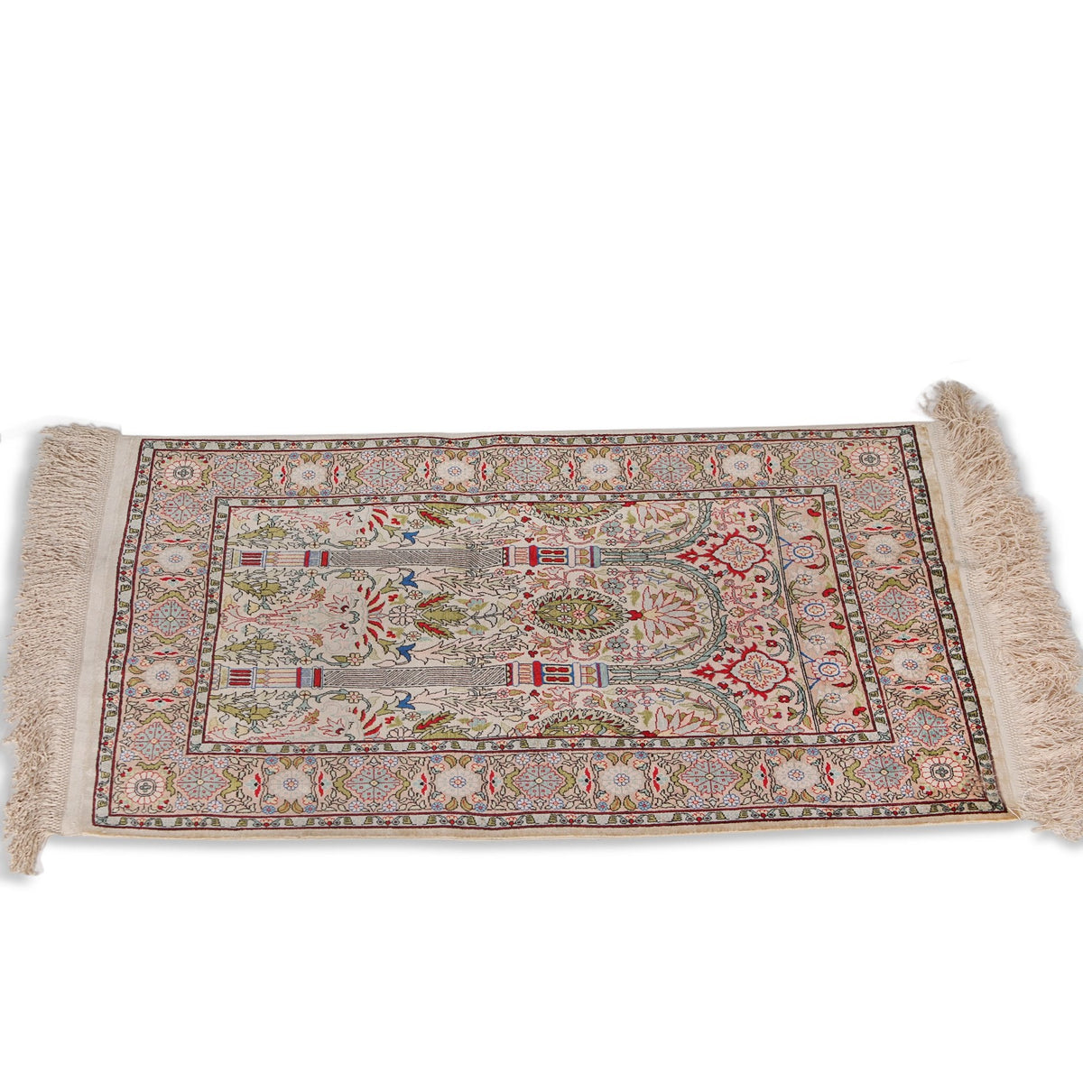 A beautiful genuine Hereke Silk Carpet Hand Knotted by skillful weavers with Wool & Silk Material, reflecting incredible care and attention to fine detail in its design and composition. Red, light green, light blue, yellow, and ivory colors permeate the visual imagery associated with prayer, perhaps signifying the interconnections of the life, flower motifs, and scrolls throughout the border.