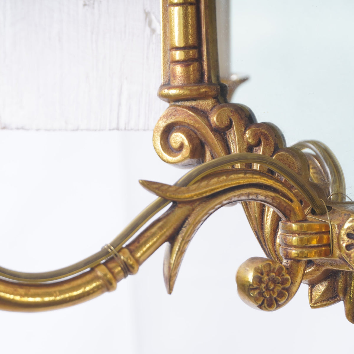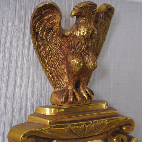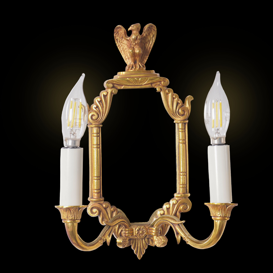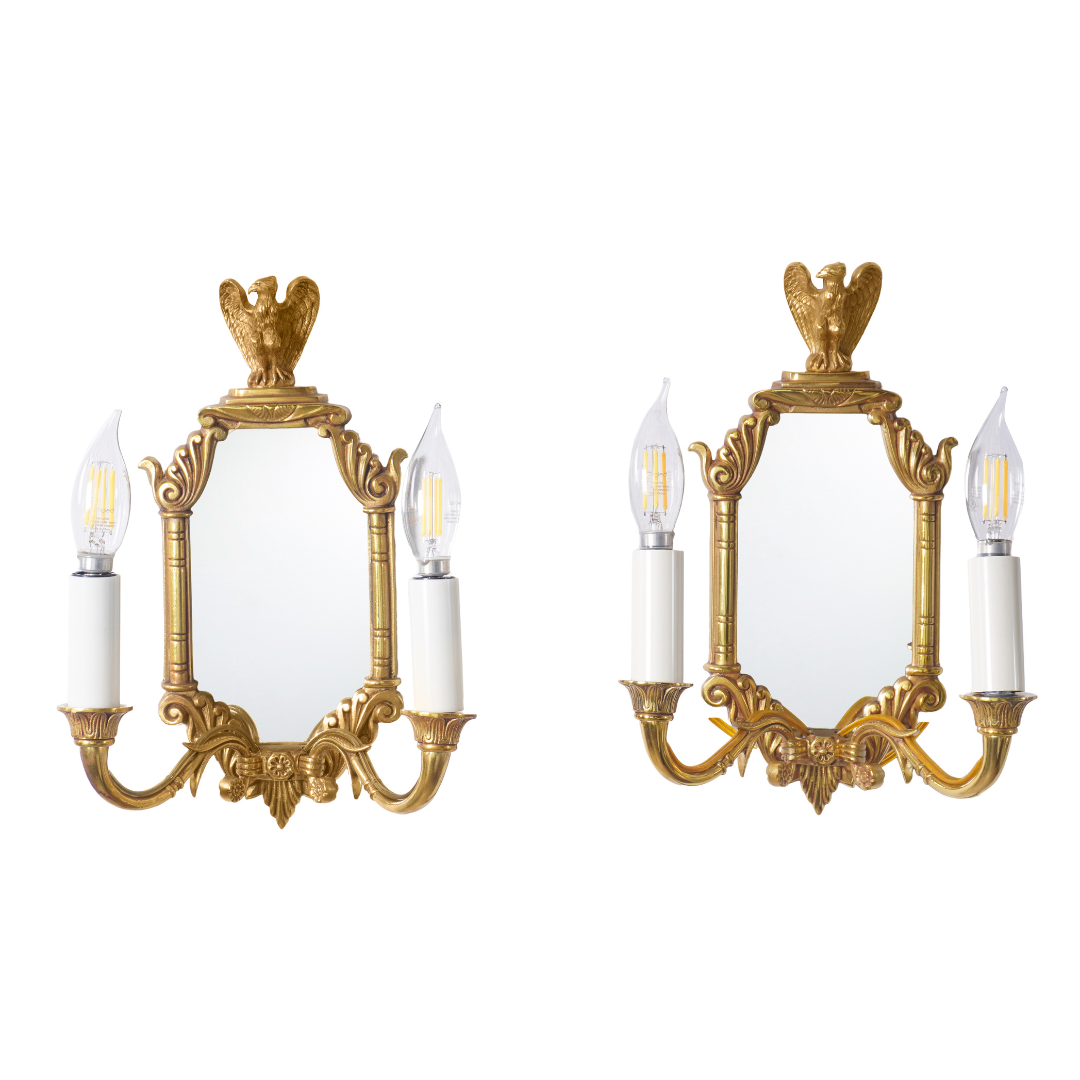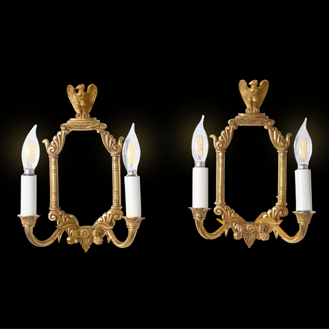 This pair of Luminaire d'Art French Empire Style Eagle Sconces exudes regal elegance with their finely cast giltwood frames, crowned by majestic eagle finials. Inspired by the grandeur of the Napoleonic era, each sconce features an octagonal mirrored backplate, flanked by two candle-style lights with white sleeves. The intricate detailing and symmetrical design make these wall fixtures perfect for adding historical charm and warm illumination to classic or neoclassical interiors. A timeless accent that blends function with refined French artistry.