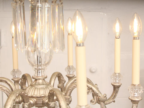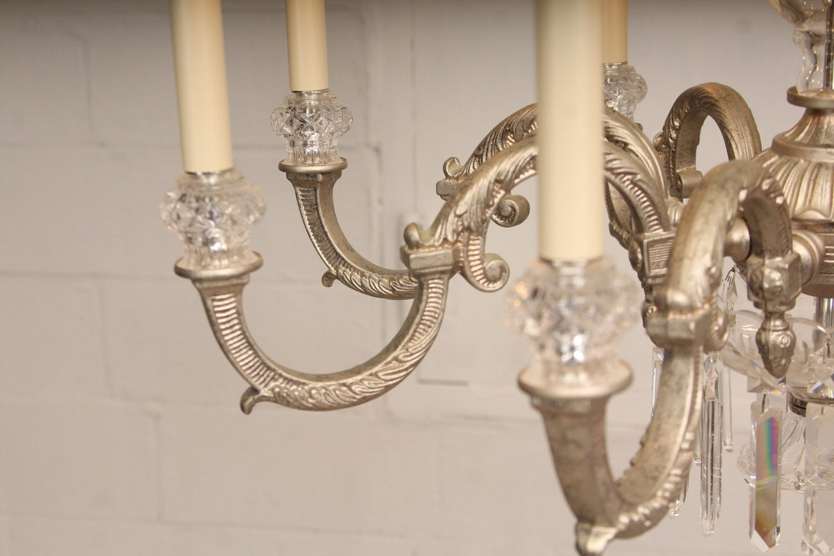 Indulge in the exquisite charm of our Vintage French Louis XV Silver Gilt Finish Chandelier, hailing from the 1980s and exuding the quintessential elegance of the Louis XV era. This stunning piece is a fusion of timeless craftsmanship and regal allure, featuring intricate silver gilt detailing that beautifully complements its graceful curves and ornate design. Adorned with delicate crystal accents, this chandelier captures the essence of opulence and sophistication synonymous with French Rococo style. A statement of refined luxury, it serves as a captivating centerpiece in any interior space, effortlessly elevating the ambiance with its aristocratic charm. Perfect for discerning designers and decorators, this vintage treasure offers a touch of timeless grandeur to projects seeking to evoke a sense of old-world glamour and prestige.