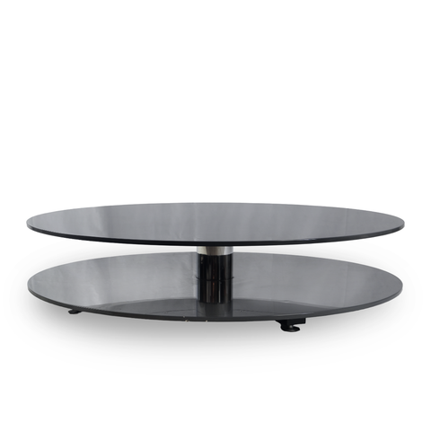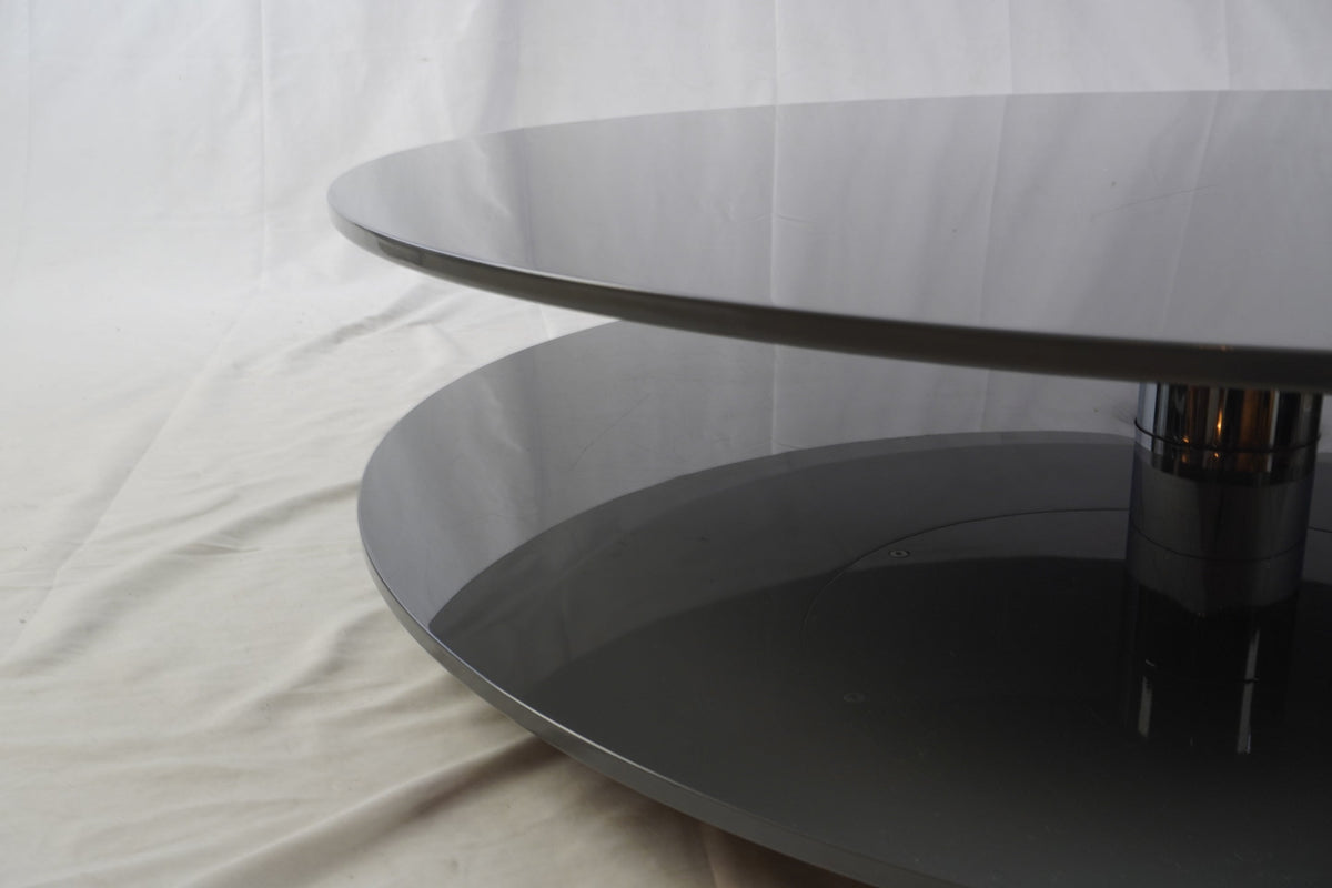 Italian Cappellini Gong Lux Coffee Cocktail Table showcases refined Italian design and precision engineering. Designed by Giulio Cappellini, this striking piece features two mirrored circular discs connected by a polished central column, creating a bold yet minimalist statement. Crafted in Italy from high-quality steel with a glossy metallic finish, the Gong Lux reflects light beautifully and enhances the sense of space in any contemporary interior. Its sculptural silhouette and balanced proportions embody modern luxury, making it an ideal centerpiece for sophisticated living rooms or designer settings.
