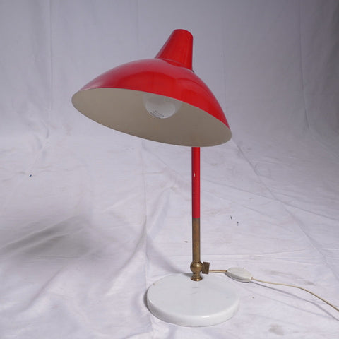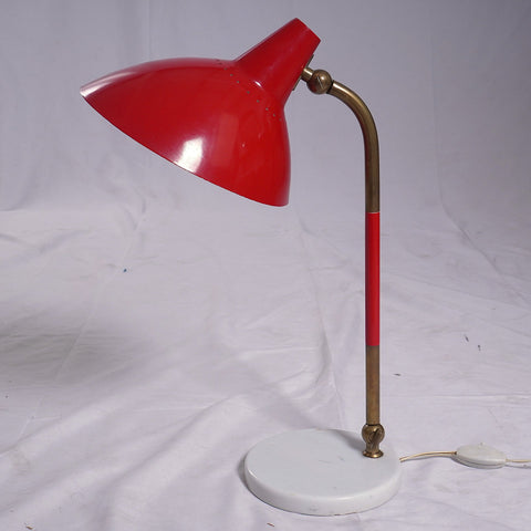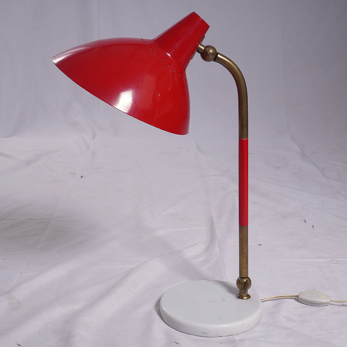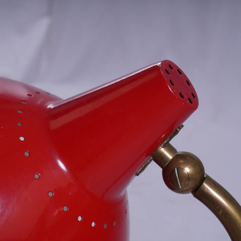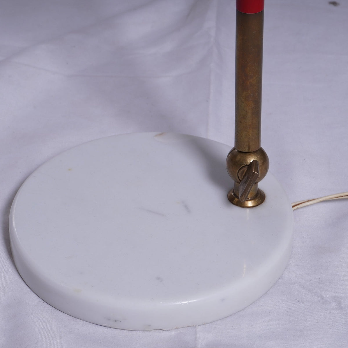 This vintage Italian Stilnovo table lamp from the 1950s brings authentic mid-century character to any interior with its sculptural silhouette and striking use of color. The design pairs a bold red metal shade with a gently curved brass arm, creating a warm, directional glow ideal for desks or bedside tables. Its white circular base adds a crisp visual balance, while the original patina on the brass introduces a subtle sense of history. A collectible example of postwar Italian lighting, this piece offers timeless style, thoughtful craftsmanship, and a vibrant accent that enhances both modern and classic spaces.