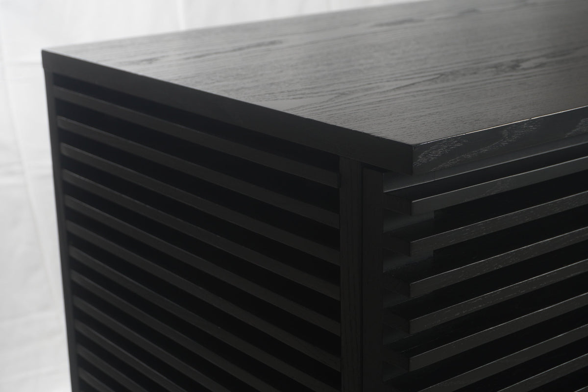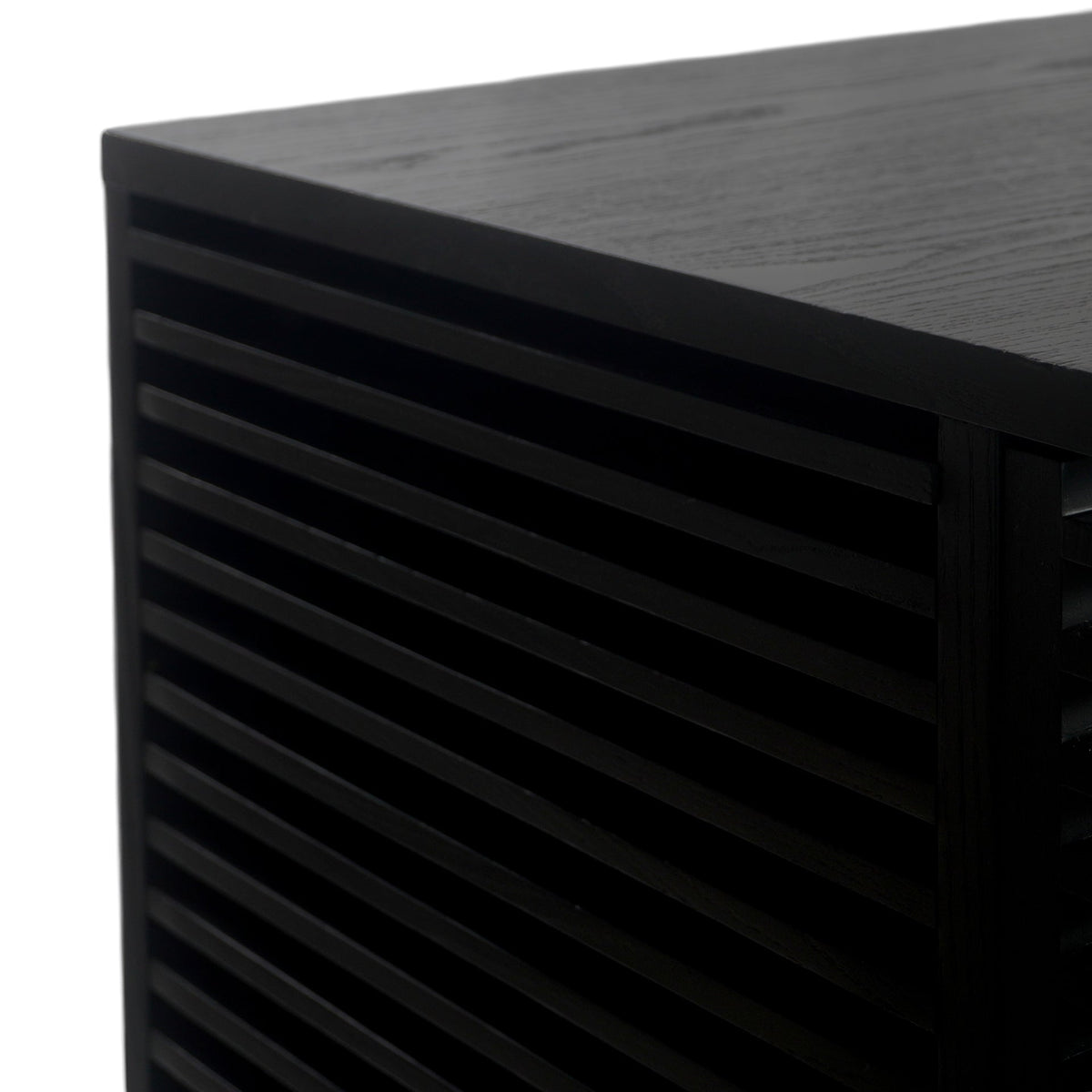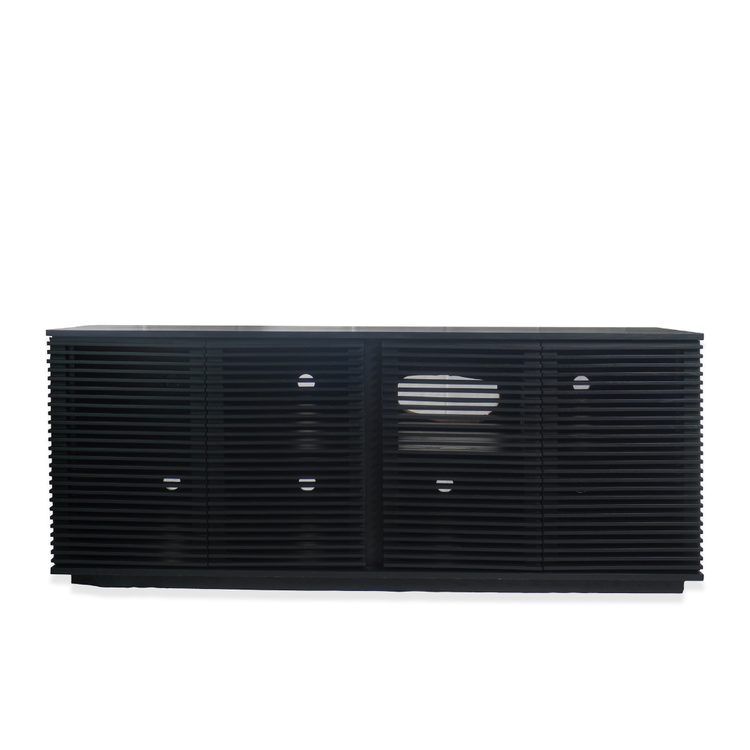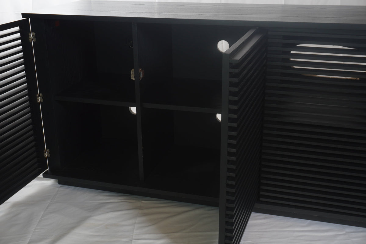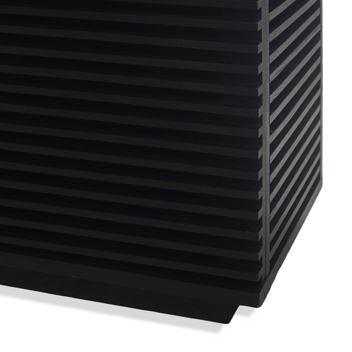 This Modern Wood Slat Media Console offers a sleek, architecturally inspired design ideal for contemporary interiors. Crafted from solid wood with a matte black finish, the piece features horizontal slatted doors that conceal ample storage while allowing remote signals to pass through—making it perfect for housing media components. The open back includes discreet cable management cutouts for a clean setup. With its minimalist silhouette and functional elegance, this console blends seamlessly into living rooms or entertainment spaces seeking modern sophistication.