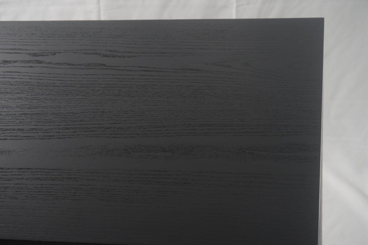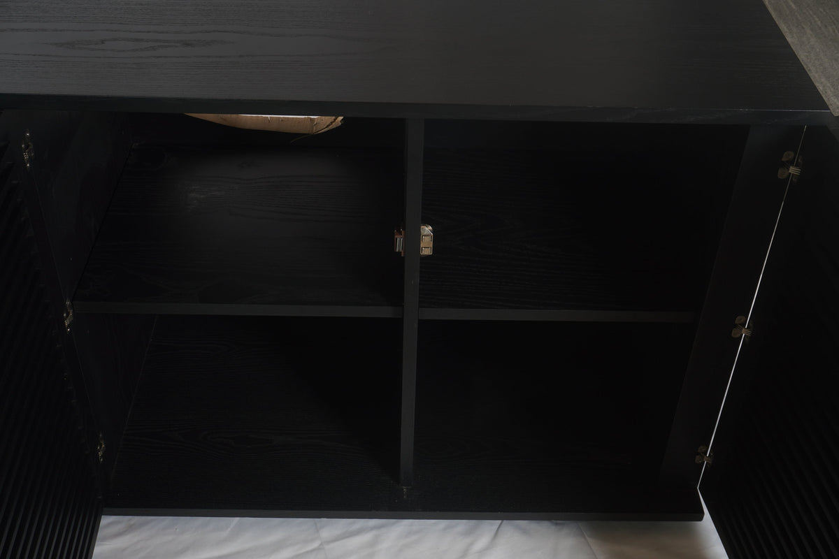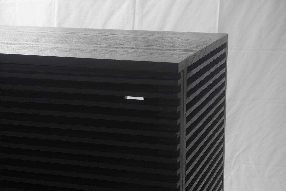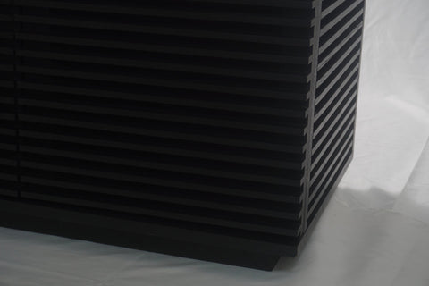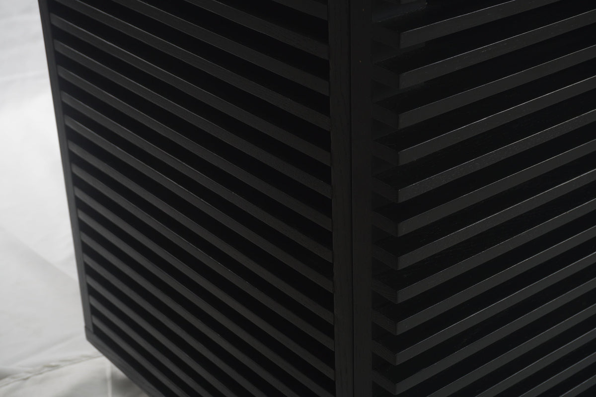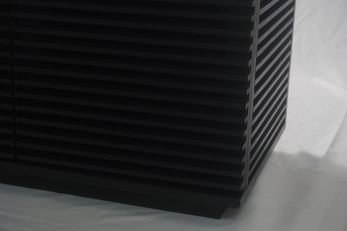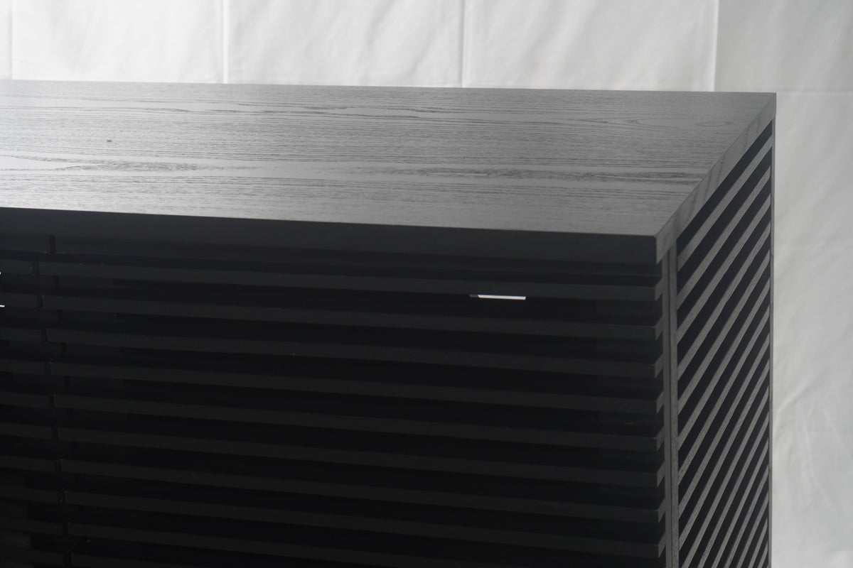 This Modern Wood Slat Media Console offers a sleek, architecturally inspired design ideal for contemporary interiors. Crafted from solid wood with a matte black finish, the piece features horizontal slatted doors that conceal ample storage while allowing remote signals to pass through—making it perfect for housing media components. The open back includes discreet cable management cutouts for a clean setup. With its minimalist silhouette and functional elegance, this console blends seamlessly into living rooms or entertainment spaces seeking modern sophistication.