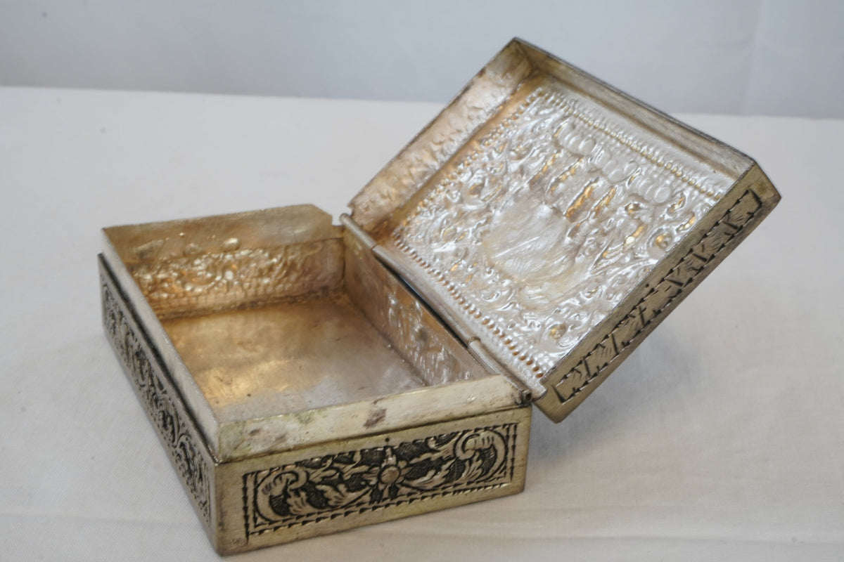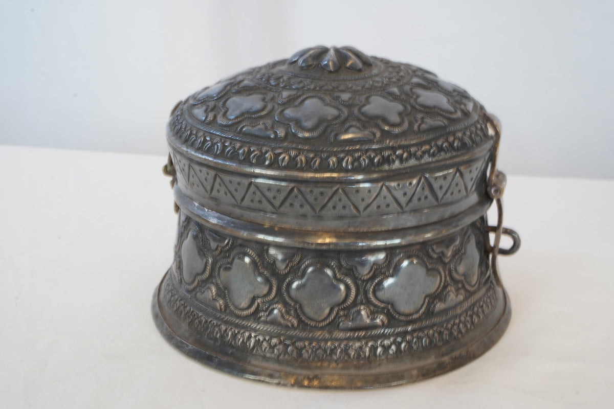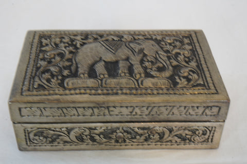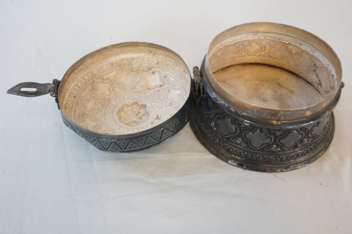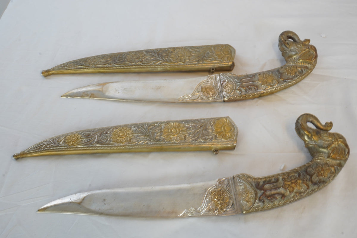 This Vintage Indian Mughal-Style set features two ornately detailed daggers and two intricately crafted jewelry boxes, reflecting the rich artistry and heritage of India’s Mughal period. The brass-clad daggers showcase elaborate floral and foliate engravings, with curved hilts that highlight traditional craftsmanship. Complementing them are two decorative jewelry boxes, one round with a domed lid and latch, the other rectangular with finely etched patterns; ideal for storing small treasures or serving as unique display accents.