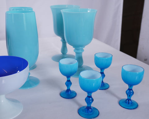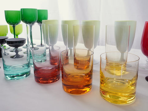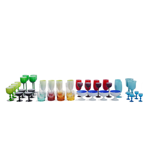 This Vintage Italian Carlo Moretti 44-Piece Glass Barware Set is a mid-century modern collection blending color, elegance, and craftsmanship. Featuring Murano-blown sherbet and champagne glasses, Moser-style whisky crystal tumblers, and Portieux-Vallerysthal inspired Murano goblets, each piece reflects refined European glassmaking tradition. The vibrant palette from green and red to blue and the variety of forms give the set a sculptural, collectible presence. A beautiful choice for designers and collectors, this barware set brings sophisticated charm and retro character to any dining table, bar cart, or entertaining space.