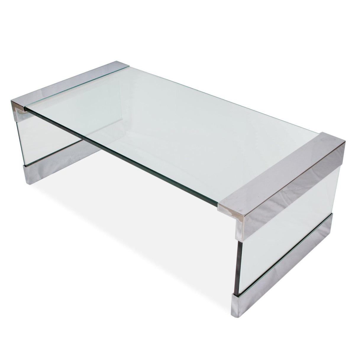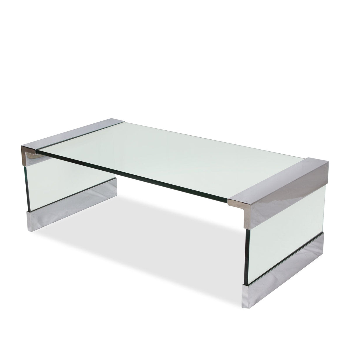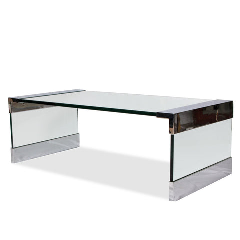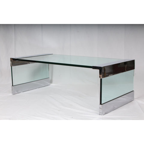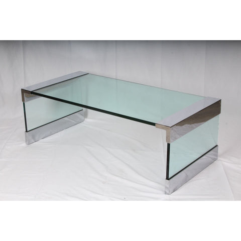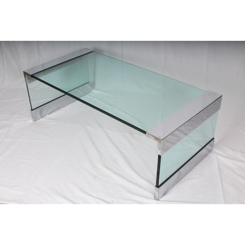 Designed by Leon Rosen for Pace Collection, this vintage waterfall coffee table is a striking example of 1970s modernism. Featuring a sleek, all-glass construction with polished nickel accents, its seamless design creates an illusion of weightlessness while maintaining a bold architectural presence. The thick glass top is supported by two substantial glass side panels, reinforced with gleaming nickel brackets that add a refined contrast. A statement piece that embodies sophistication, this table effortlessly complements contemporary and mid-century interiors alike.