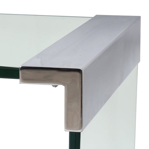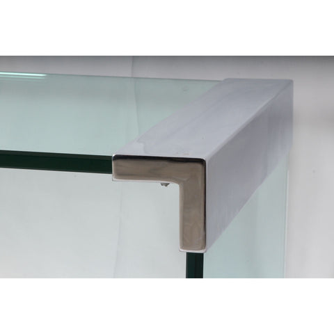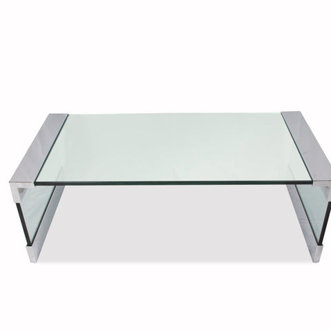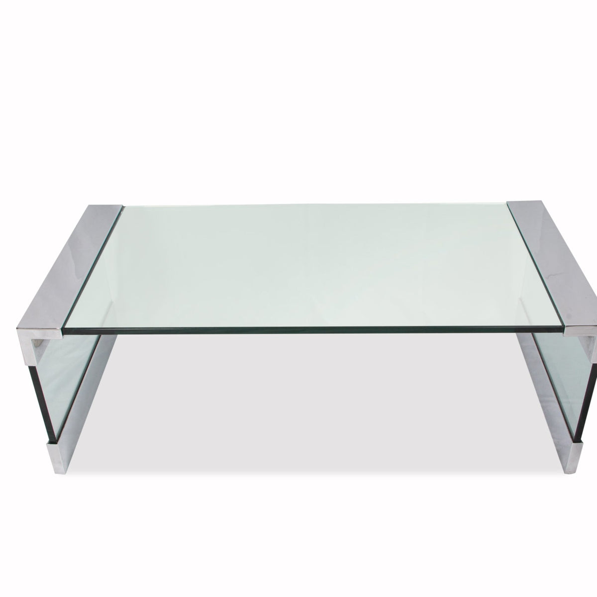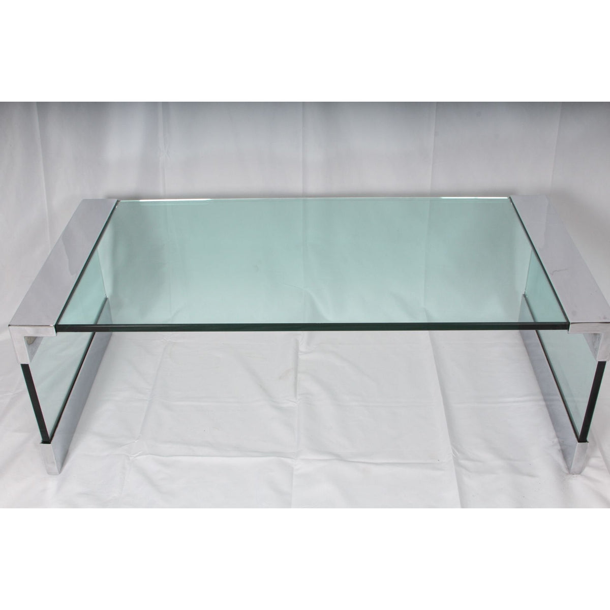 Designed by Leon Rosen for Pace Collection, this vintage waterfall coffee table is a striking example of 1970s modernism. Featuring a sleek, all-glass construction with polished nickel accents, its seamless design creates an illusion of weightlessness while maintaining a bold architectural presence. The thick glass top is supported by two substantial glass side panels, reinforced with gleaming nickel brackets that add a refined contrast. A statement piece that embodies sophistication, this table effortlessly complements contemporary and mid-century interiors alike.